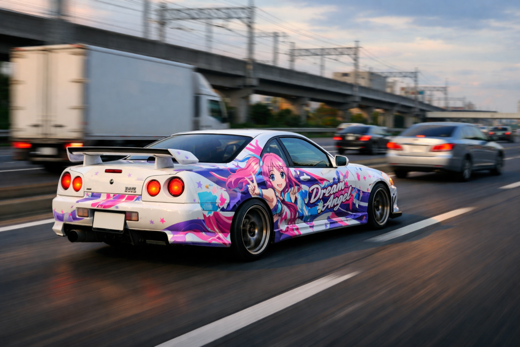 「あっ、あの車……ほとんど全面アニメですね。目立ちたがりっすかね?」