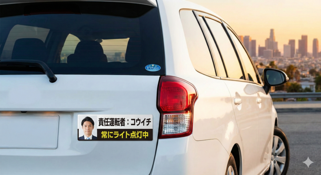 社長の方針で後部に貼られた【顔写真入り・責任運転者プレート】。
