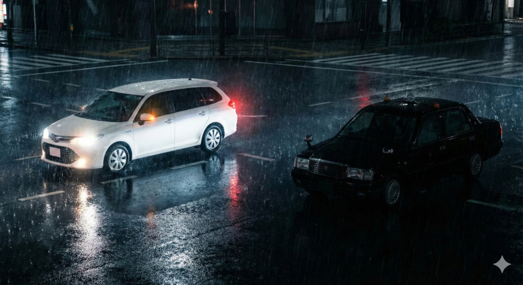 信号待ちで向かいに停車したタクシー。