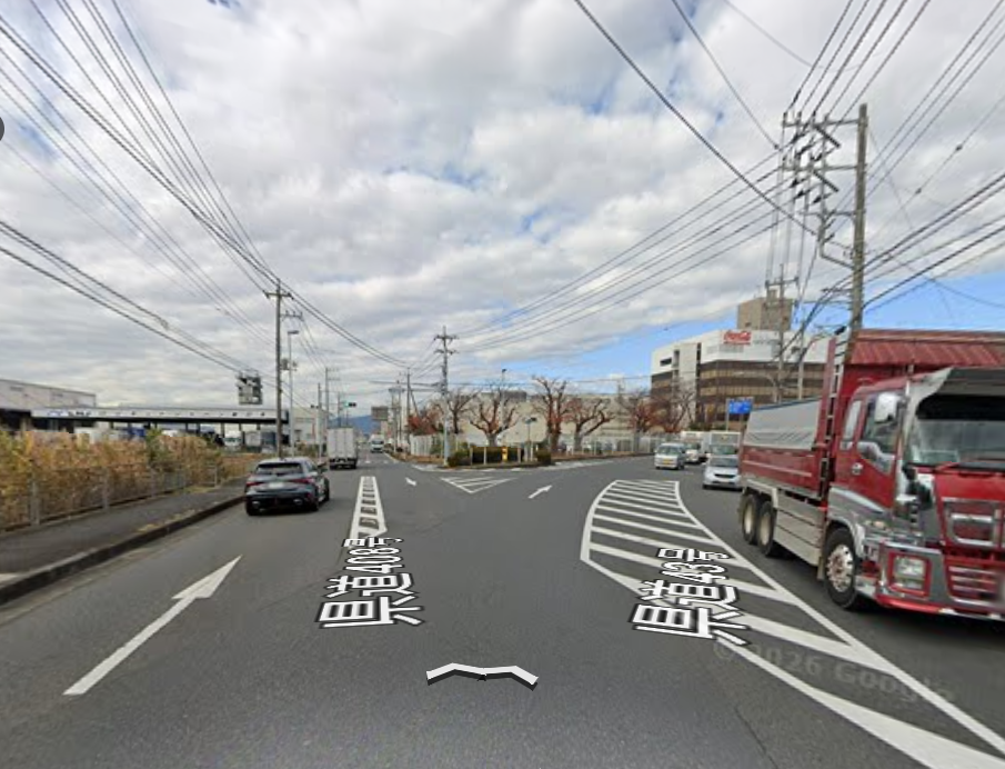 直角ではない、大きく右にカーブする交差点。