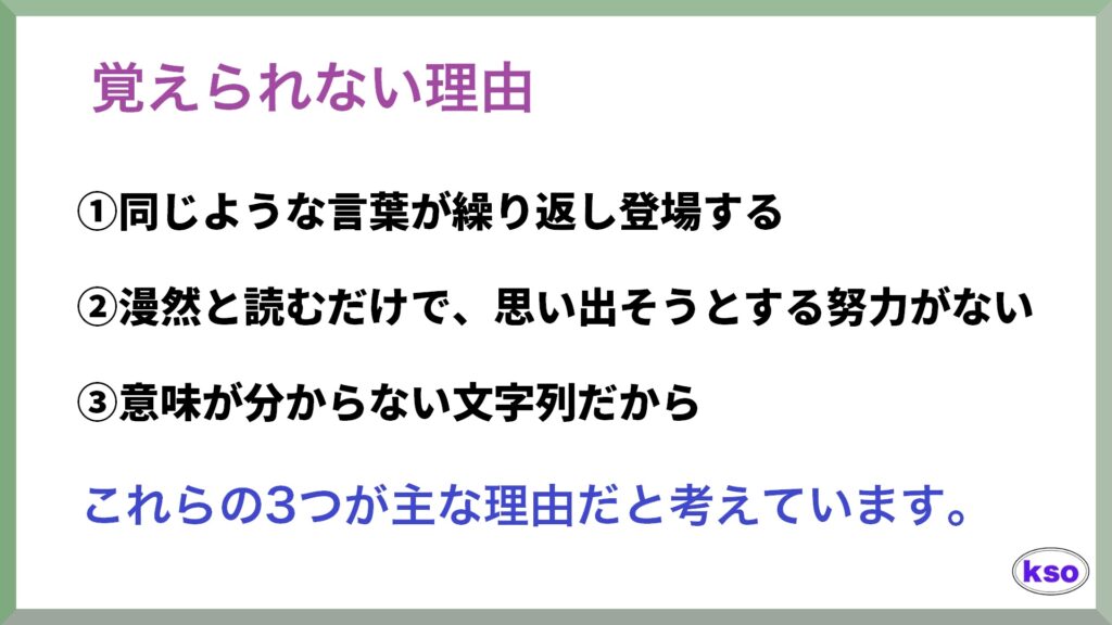 イメージやストーリーの工夫が難しく、得意不得意によって他の人と差が出てしまいます。私自身、このような覚え方が非常に苦手でした。